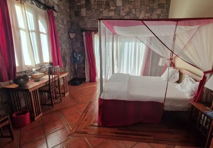 Det finns 22 rum av olika storlek. Alla rum är dock rymliga. De är möblerade med massiva trämöbler med färgade kuddar, och det finns ofta också trä på väggarna, vilket livas upp med färgglada gardiner, så att det som annars skulle kunna upplevas som mörkt istället är charmigt. Alla rum har luftkonditionering, värdeskåp, minibar, TV och Wi-Fi (i den mån det fungerar).