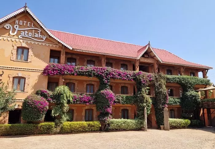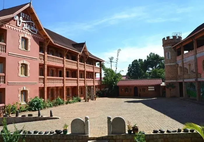 I närheten av centrala Antsirabe hittar du Hotel Vatola. Vid en första anblick kan arkitekturen upplevas som ganska speciell – men det här är den klassiska stilen i området.
