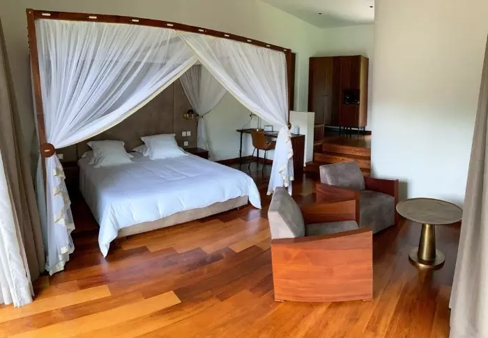 Bungalowerna är något i särklass! I varje bungalow finns ett badrum med ett fristående badkar, en privat balkong med utsikt över en sjö, te- och kaffefaciliteter, sänglinne i finaste bomull, en minibar och Wi-Fi (som på bästa Madagaskar-sätt kan vara lite instabil). Bungalowerna ligger på två nivåer och har plats för både en säng och en liten relaxavdelning, och är inredda i dämpade neutrala färger.