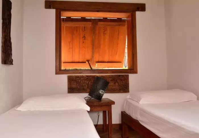 Hotellets 18 rum är relativt enkelt inredda med rustika möbler och gott om plats för bagaget. Naturligtvis har de alla eget badrum (om än av lite äldre snitt), fläkt och myggnät över sängarna.