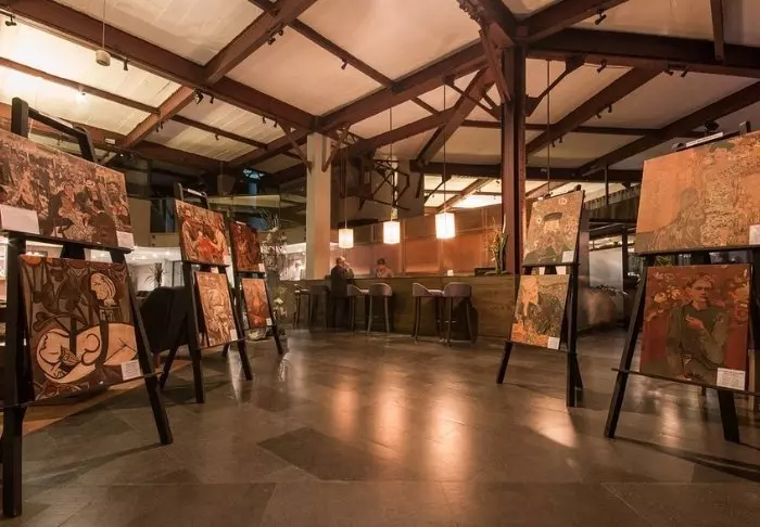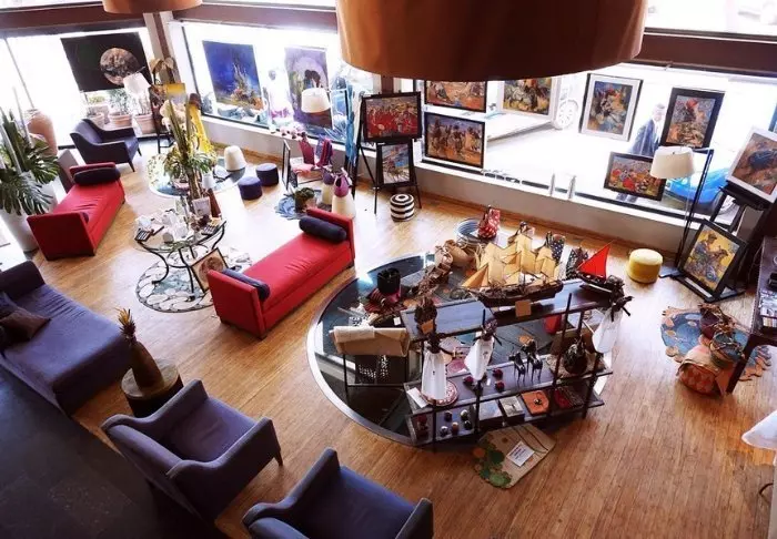 På mezzaninen finns det ofta ”workshops” där lokala konstnärer arbetar och visar sin konst – ett bra tillfälle att köpa en unik souvenir.