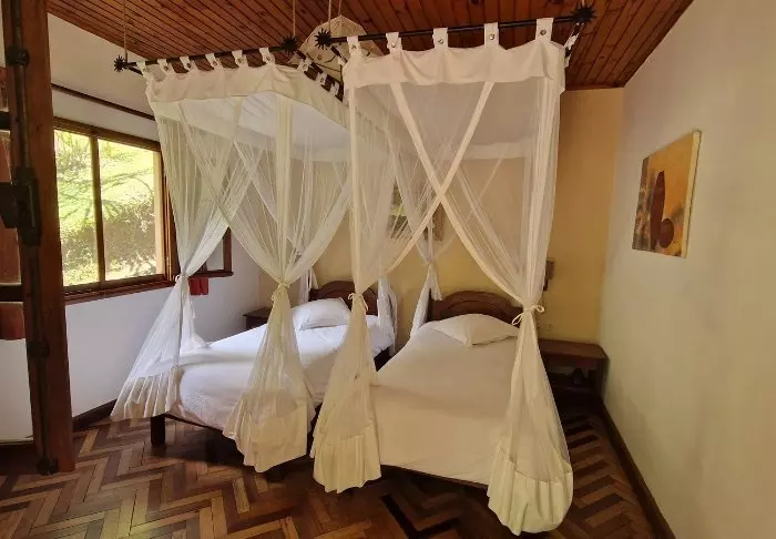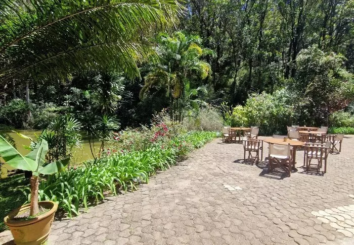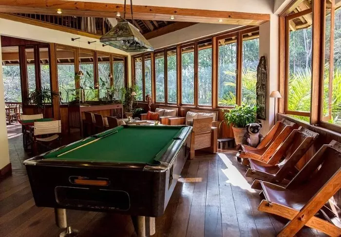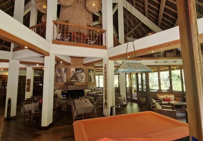 Lodgen är däremot definitivt värd ett besök i sig. Det finns 28 bungalows, enkelt inredda med en säng med myggnät, takfläkt, värdeskåp och minibar. Den stora attraktionen är lodgens läge mitt i regnskogen, och i synnerhet restaurangen, som har en veranda byggd över en liten sjö.