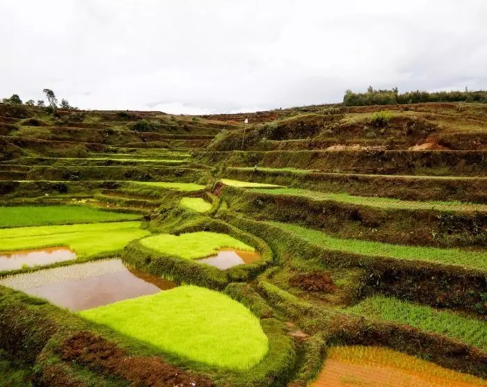 Det finns risfält överallt. Det sägs ibland att madagaskerna tilllhör dem som konsumerar mest ris över hela världen dagligen. Faktum är att de är så förtjusta i det att riset som alltid bränns fast i botten av kokkärlet får bränna fast lite till innan de kokar te på det. Teet, som kallas ”ranovola”, dricks sedan till en risbaserad rätt. Det smakar lite speciellt, som en korsning mellan bränt ris och popcorn, men i form av te. Så, nu är du förvarnad om du skulle bli bjuden på “ranovola”.
