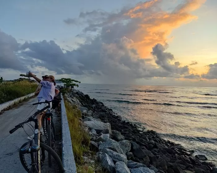 Du blir hämtad på hotellet och körd till den lilla fiskebyn Kuala Teriang på Langkawis västkust. Här får du en cykelhjälm och din cykel justeras för optimal komfort, och efter en kort genomgång börjar cykelturen. Du cyklar på mindre stigar omgiven av vacker natur.Längs vägen kan du njuta av den majestätiska Mat Cincang-bergskedjan som reser sig i bakgrunden, samt frodiga risfält, fruktodlingar, färgglada trädgårdar och små fiskehamnar.