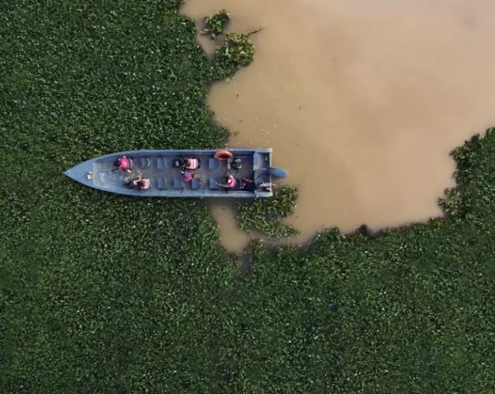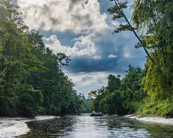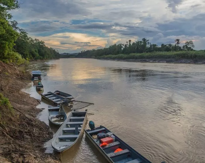 När du kliver ombord på den lilla båten kan du luta dig tillbaka och njuta av regnskogens fridfulla atmosfär medan du glider iväg i soluppgången. Landskapet omkring dig är som taget ur en saga med vyer som får vem som helst att tappa andan. Flodens slingrande lopp passerar genom både öppen och tät regnskog, där vrålapor och sjungande fåglar bildar ett unikt ljudlandskap.