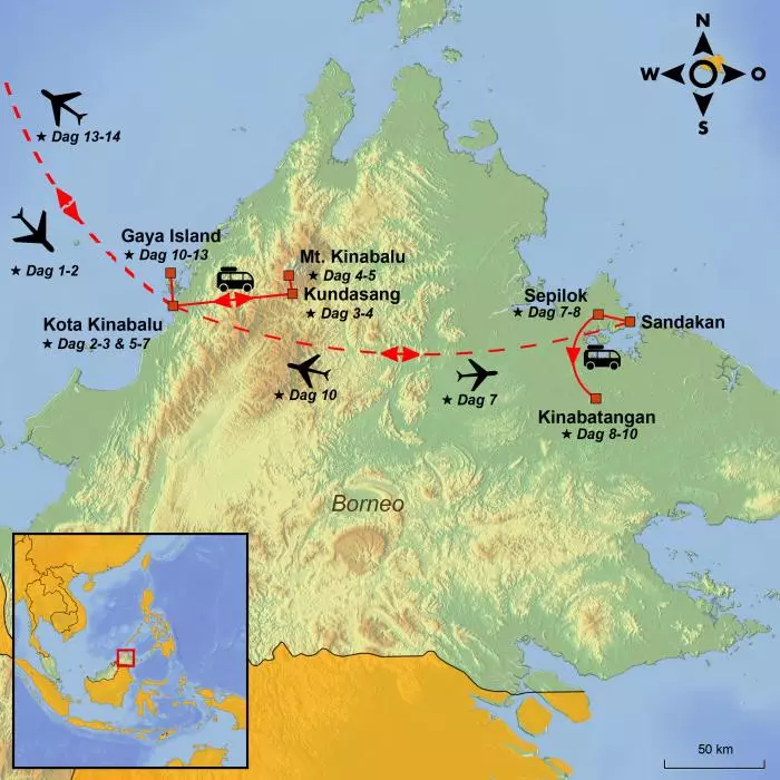 Du landar i Kota Kinabalu på världens tredje största ö, Borneo. Ön är huvudsakligen indonesisk i söder, medan det lilla landet Brunei ligger mellan de två malaysiska delstaterna, Sabah och Sarawak, som ligger i norr och erbjuder en mängd spektakulära natur- och djurupplevelser.