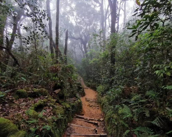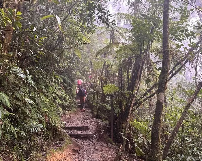 Du lämnar Timpohon Gate och kliver in i frodigt regnskogslandskap där cikadornas och fåglarnas ljud ackompanjerar dina steg. Stigen slingrar sig genom täta buskage och höga träd, medan den fuktiga luften gradvis ersätts av svalare temperaturer ju högre upp du kommer på berget.