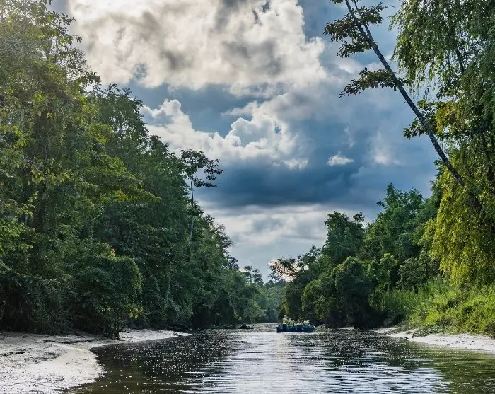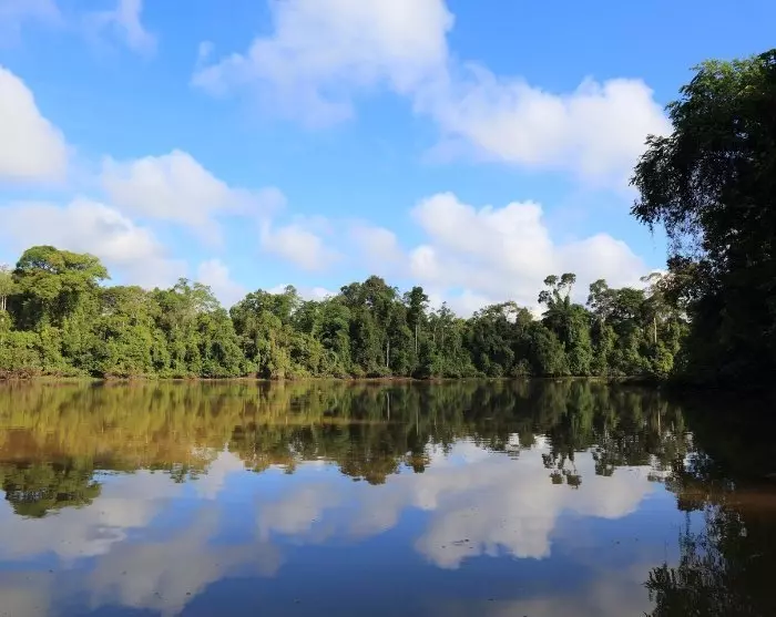 När du kliver ombord på den lilla båten kan du luta dig tillbaka och njuta av regnskogens fridfulla atmosfär medan du glider fram i soluppgången. Landskapet runt dig är som taget ur en saga, med scener som kan få vem som helst att tappa andan. Flodens slingrande lopp går genom både öppen och tät regnskog, där vrålande apor och sjungande fåglar skapar ett unikt ljudlandskap.
