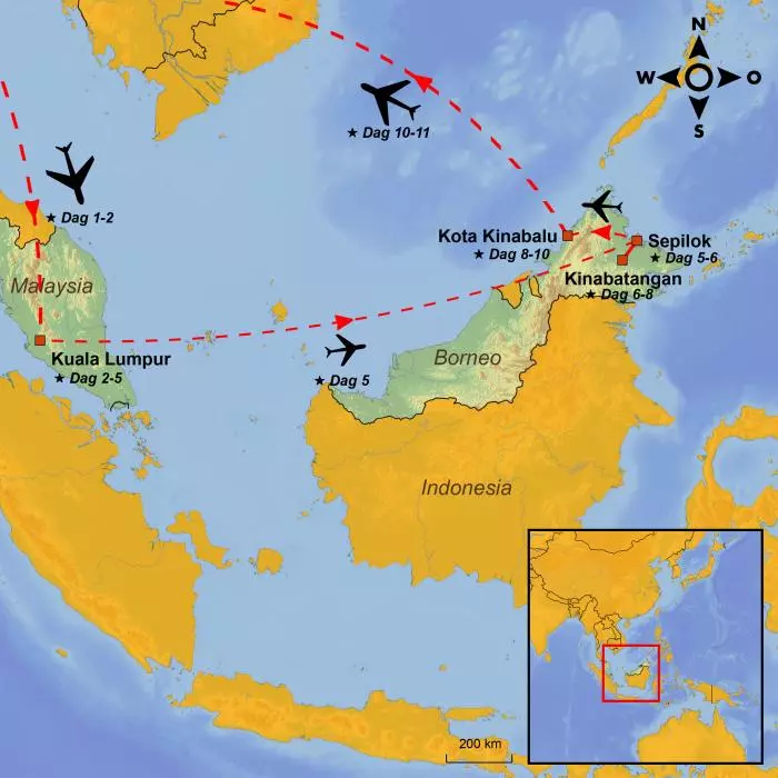 Idag fortsätter resan och du lämnar Kuala Lumpurs sevärdheter och flyger vidare till världens tredje största ö, Borneo. Ön är huvudsakligen indonesisk i söder, medan det lilla landet Brunei ligger mellan de två malaysiska staterna Sabah och Sarawak i norr, som erbjuder en överflöd av spektakulära natur- och djurupplevelser.