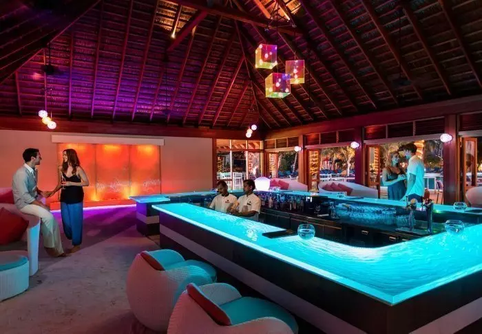 På kvällen, när solen sakta går ner, kan du njuta av en drink på en av öns loungebarer, som erbjuder en avslappnad atmosfär med utsikt över stranden.