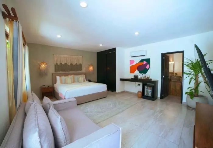 Alla rum är unikt inredda och utrustade med moderna faciliteter såsom wifi, minibar, aircondition, tv, Nespresso-maskin och värdeskåp. De har dessutom egen balkong eller terrass, där du kan koppla av med en bra bok. Bor du på första våningen kan du njuta av att sova under det palmtäckta taket.