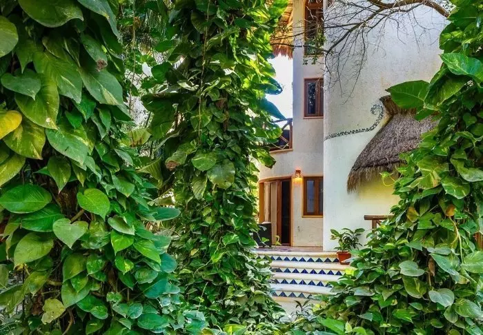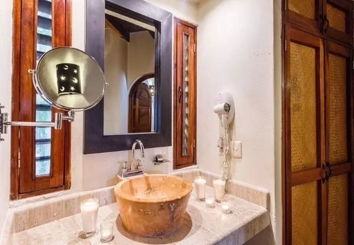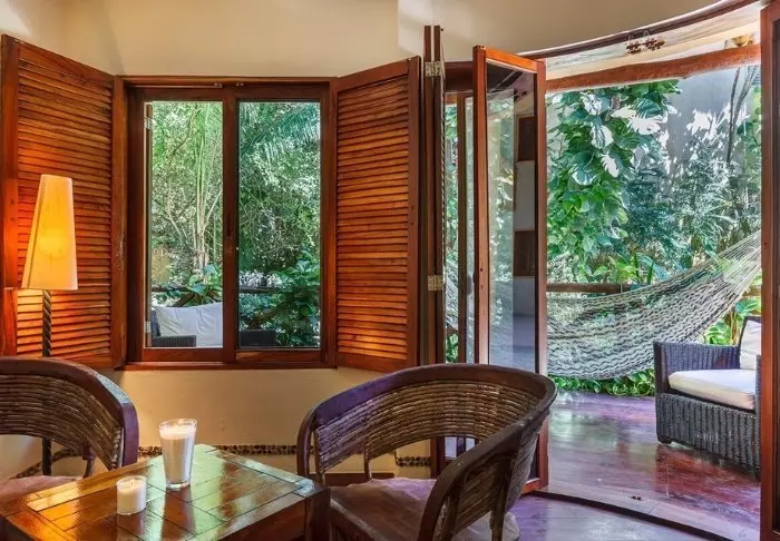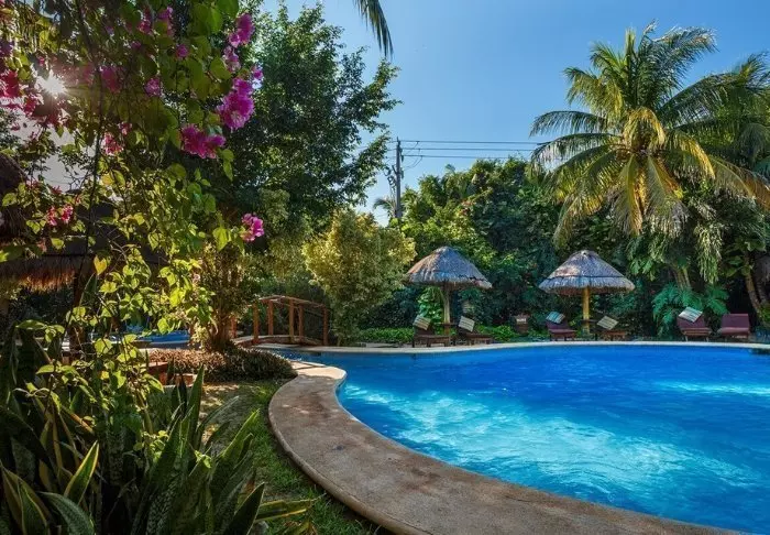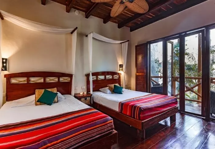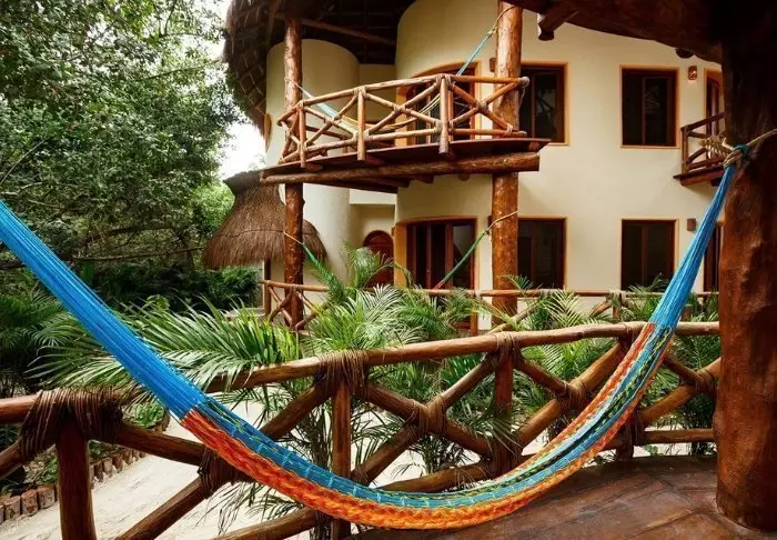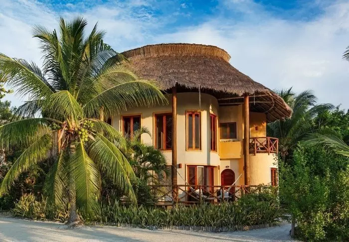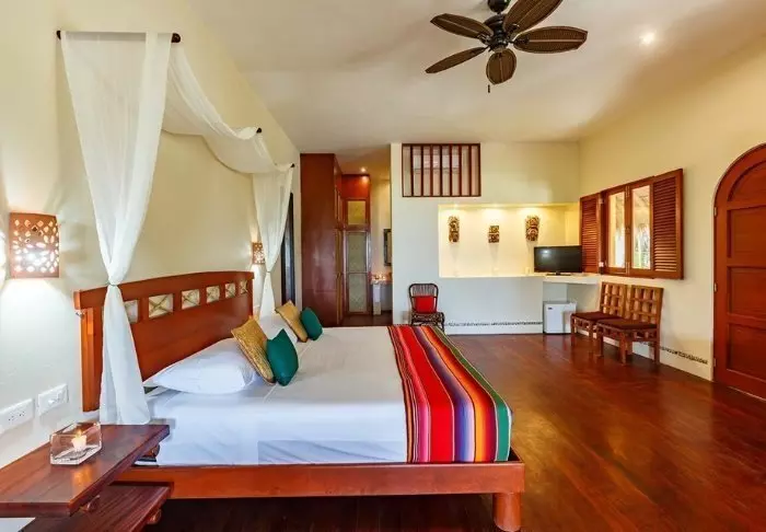Du bor i charmiga stugor byggda i naturmaterial, med tak av torkade palmblad. Rummen är rymliga och elegant inredda med en harmonisk blandning av ljusa färger, färgglada mexikanska mattor och kuddar samt vackra mörka trägolv och möbler.