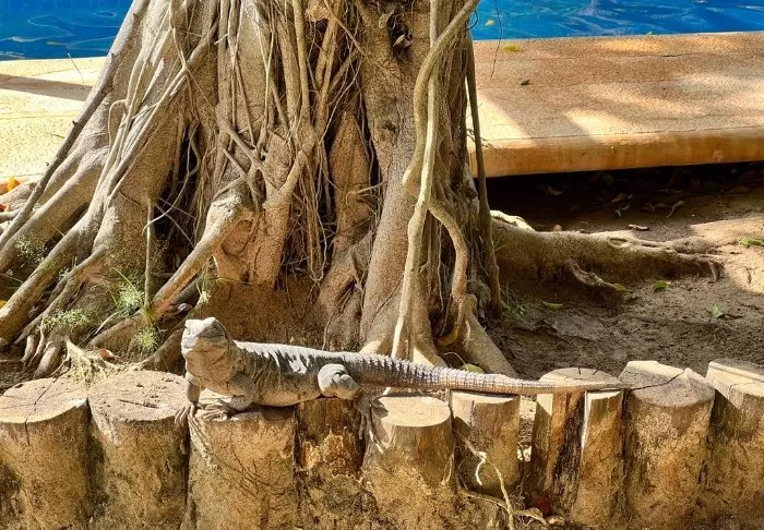 Rummen är utspridda i den grönskande trädgården, och de många träden ger både härlig skugga från solen och bidrar till en extra naturupplevelse eftersom vackra exotiska fåglar besöker den. Du kan också ha turen att ibland få syn på en lat ödla eller leguan som kryper ner från ett träd.