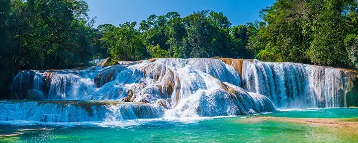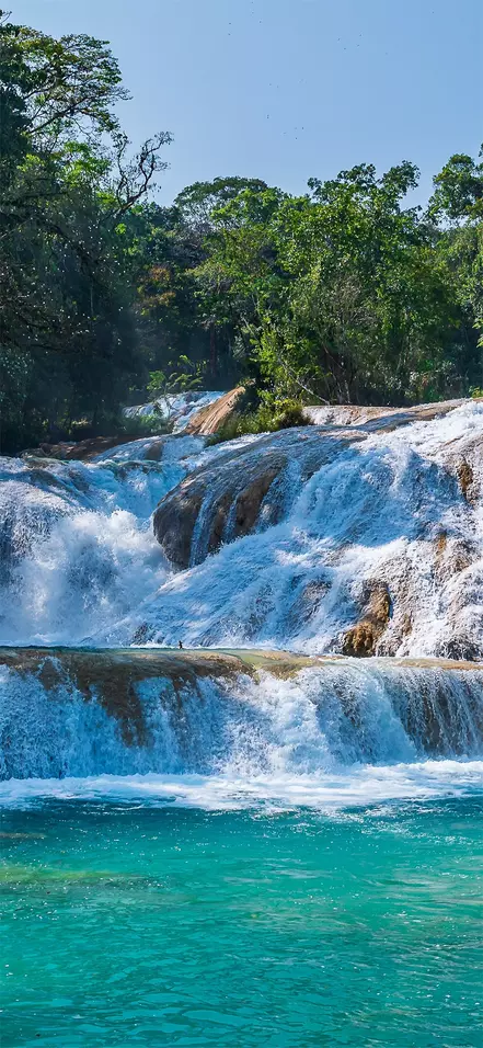 Första stoppet är vid Agua Azul-fallen (de blå vattenfallen), en serie forsande vattenfall där turkosblått vatten rinner över vita kalkstensavsatser i flera nivåer. Vattnets karakteristiska färg beror på det höga innehållet av mineraler och kalk, vilket reflekterar solljuset och skapar en nästan sagolik kuliss. Vattenfallen ligger mitt i frodig regnskog, och längs floden bildas små naturliga bassänger där du kan ta ett uppfriskande dopp. Nästa stopp är Misol-Ha-vattenfallet, ett enstaka vattenfall på cirka 35 meter, som faller dramatiskt ner i en smaragdgrön lagun mitt i regnskogen. En liten stig leder bakom vattenfallet, där du kan stå i skydd av den brusande kaskaden och uppleva naturens krafter på nära håll.