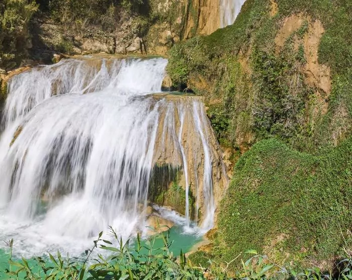 Första stoppet är vid Agua Azul-fallen (de blå vattenfallen), en serie forsande vattenfall där turkosblått vatten rinner över vita kalkstensavsatser i flera nivåer. Vattnets karakteristiska färg beror på det höga innehållet av mineraler och kalk, vilket reflekterar solljuset och skapar en nästan sagolik kuliss. Vattenfallen ligger mitt i frodig regnskog, och längs floden bildas små naturliga bassänger där du kan ta ett uppfriskande dopp. Nästa stopp är Misol-Ha-vattenfallet, ett enstaka vattenfall på cirka 35 meter, som faller dramatiskt ner i en smaragdgrön lagun mitt i regnskogen. En liten stig leder bakom vattenfallet, där du kan stå i skydd av den brusande kaskaden och uppleva naturens krafter på nära håll.