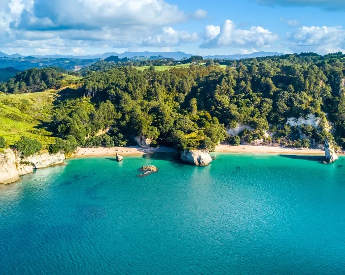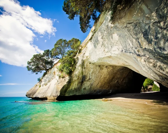 Efter lunchen (på egen bekostnad) fortsätter resan till den berömda klippformationen Cathedral Cove, ett av Nya Zeelands mest ikoniska naturfenomen.