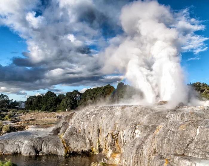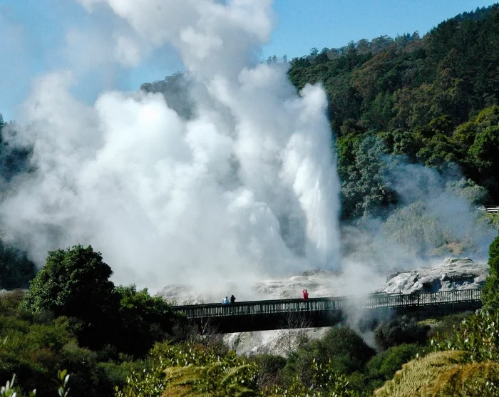 Du blir upphämtad på ditt hotell i Rotorua och första stoppet är Te Puia Thermal Park. Här kan du uppleva bubblande lera och dramatiska gejsrar, bland annat Pōhutu-gejsern som sprutar upp till 30 meter högt flera gånger om dagen.