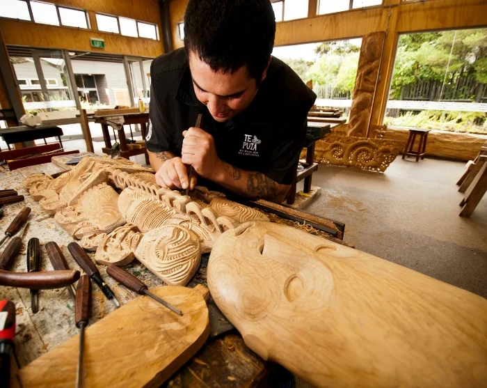 Te Puia rymmer också New Zealand Māori Arts and Crafts Institute, där du kan se vävning och träsnideri utförda enligt gamla traditioner. Du har dessutom möjlighet att uppleva en traditionell maoriföreställning.