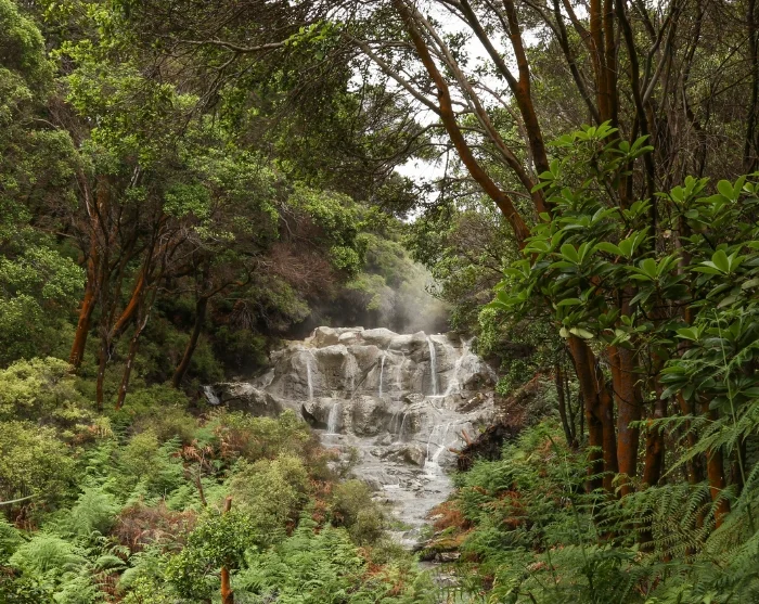 Under promenaden passerar du platser med namn som “Inferno Pools”, “Sulphur Crystal Valley” och “Cooking Pool” där temperaturen kan nå upp mot 100 grader. Ett av höjdpunkterna är Kakahi Falls – Nya Zeelands största varma vattenfall, som traditionellt användes av maorikrigare för att läka sår efter strider.