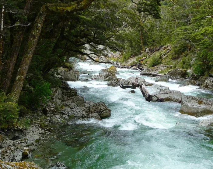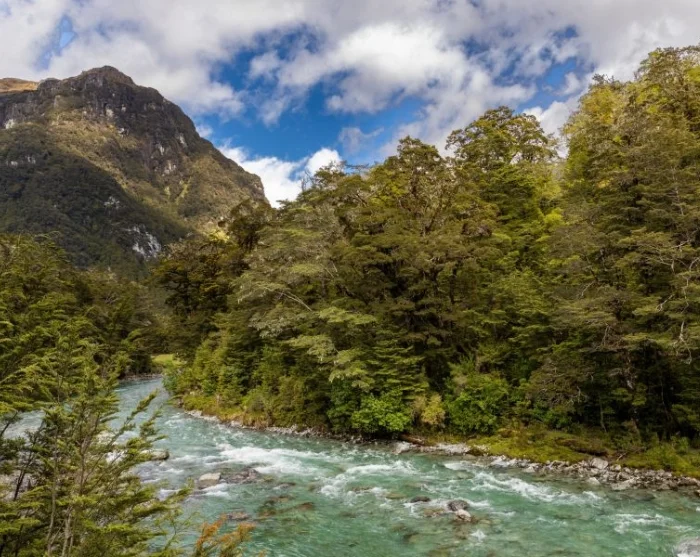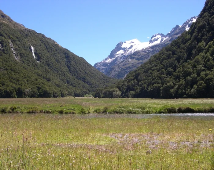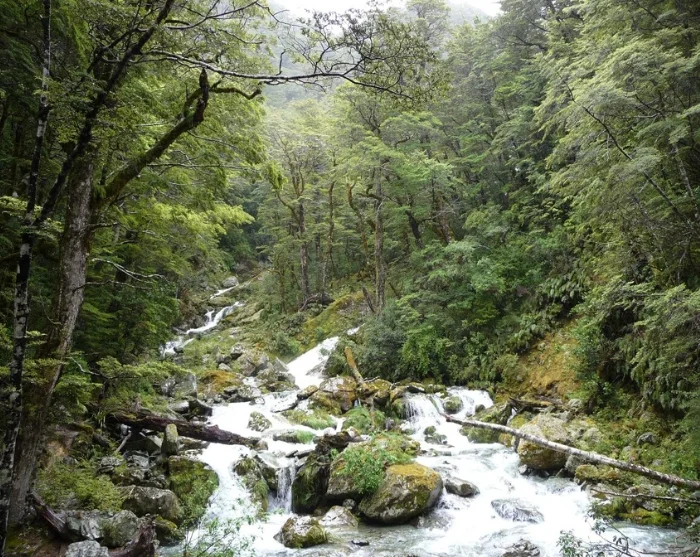 Du inleder med att korsa en hängbro över Routeburn-floden och går sedan vidare in i en imponerande bokskog. Stigen är jämn och relativt platt, vilket ger dig goda chanser att spana på fåglar som rör sig genom trädtopparna. Kanske har du turen att få syn på Nya Zeelands minsta fågel, klättersmyg (Acanthisitta chloris), eller den sällsynta gulhuvade mohua (Mohoua ochrocephala), som är endemisk för Nya Zeeland.