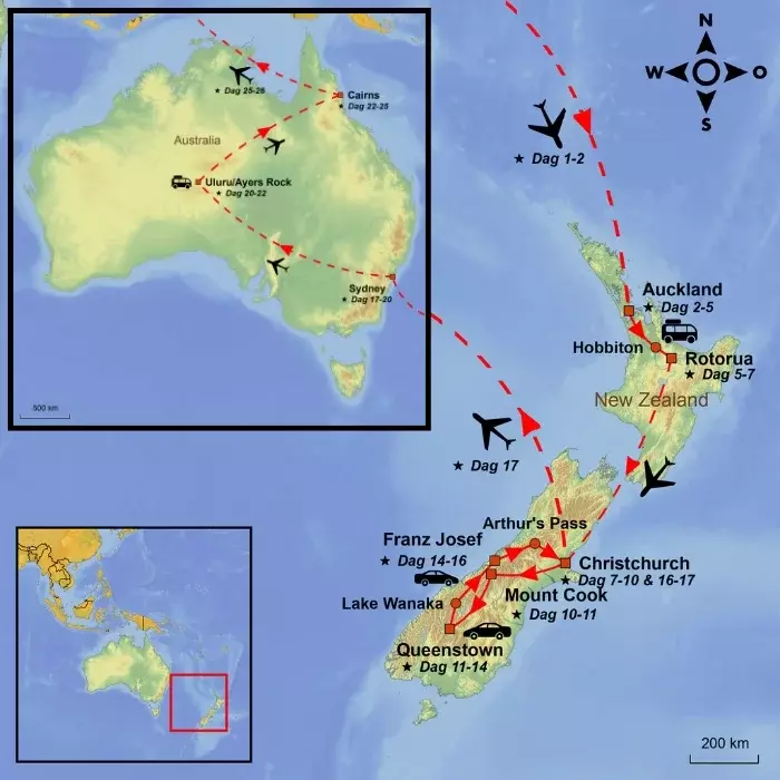 Äventyret börjar i Nya Zeeland med maorikultur, geotermiska underverk, bergsjöar och glaciärer och fortsätter vidare i Australien med Sydney, den röda outbacken vid Uluru och avslutas i tropiska Cairns.
