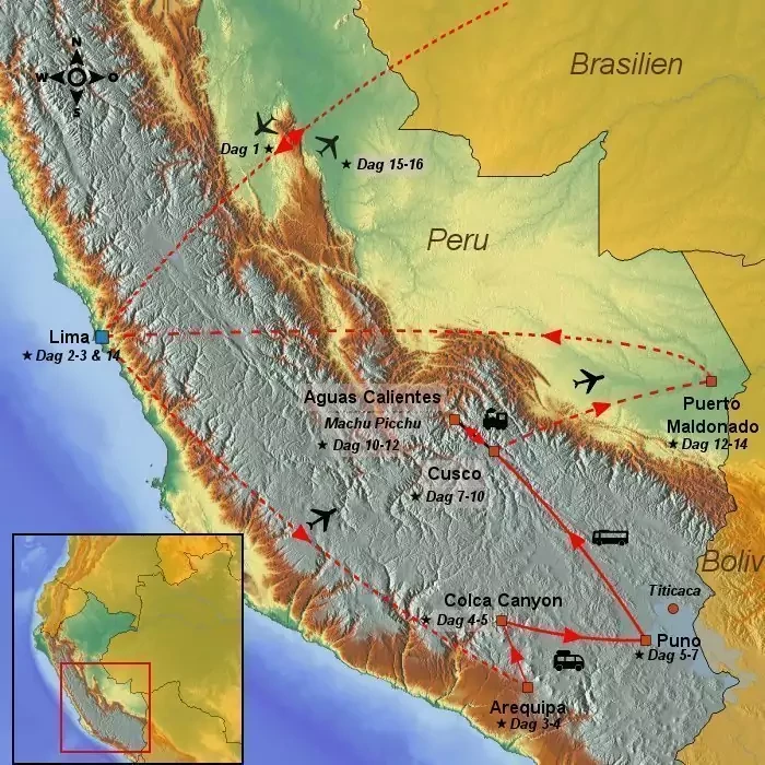 Peru är ett otroligt vackert och spännande land. Denna resa tar dig med på ett äventyr du sent kommer att glömma. Du kan se fram emot att få uppleva städerna Lima och Arequipa, som båda har många vackra kolonialtidsbyggnader. Omgiven av storslagna vulkaner hittar du den djupa dalen Colca Canyon med mysiga byar, forntida odlingsterrasser och ett spännande djurliv bestående av lamor, alpackor och kondorer. Vid den högt belägna Titicacasjön får du inblick i indianernas kultur och vardag. Du besöker Inkarikets gamla huvudstad Cusco med beundransvärdig stenhuggarkonst, Den Heliga Dalen med imponerande terrassystem, charmiga byar och färgglada marknader samt det berömda Machu Picchu, som är ett av världens nya underverk. Resan slutar i den frodiga Amazonas-regnskogen med färgglada fjärilar, grodor, papegojor och otaliga gröna växter.