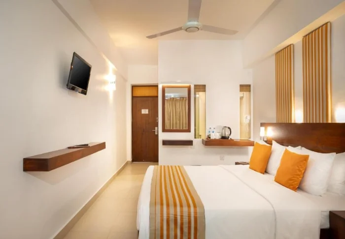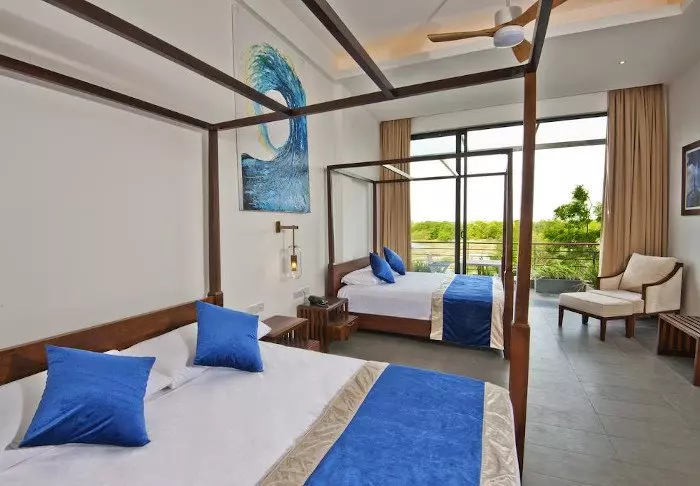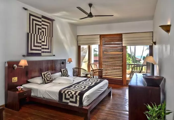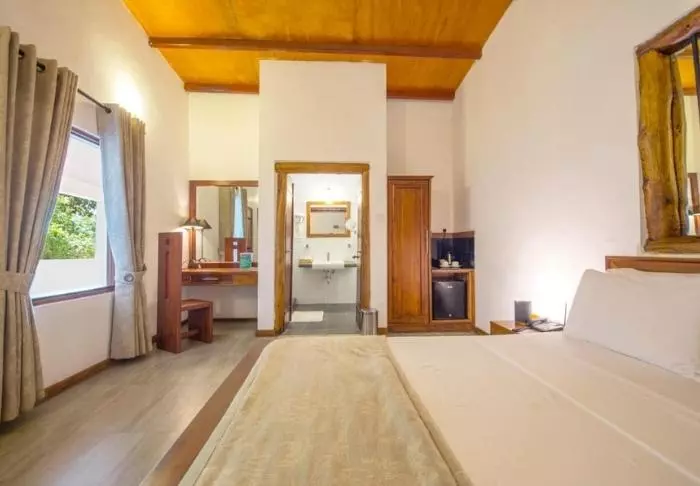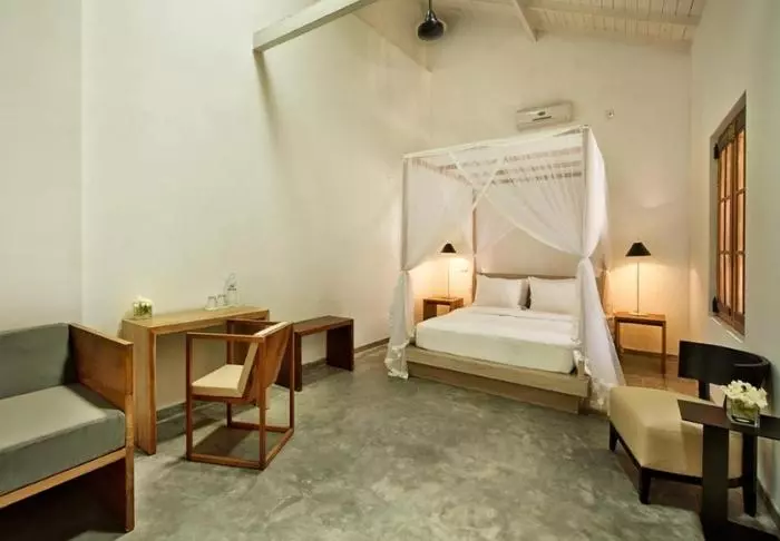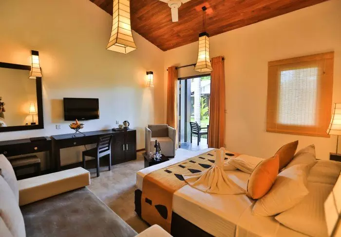Du bor som standard i ett Deluxe-rum med modern, minimalistisk stil, där ljusa färger och srilankesiska detaljer skapar en perfekt balans mellan enkelhet och värme. Här har du tillgång till både aircondition, wifi, TV, värdeskåp, skrivbord, sittgrupp, telefon och minibar. Badrummet är utrustat med både badkar och dusch samt härliga toalettartiklar. Dessutom har du en egen balkong där du kan njuta av den fridfulla trädgården med en bra bok i handen.