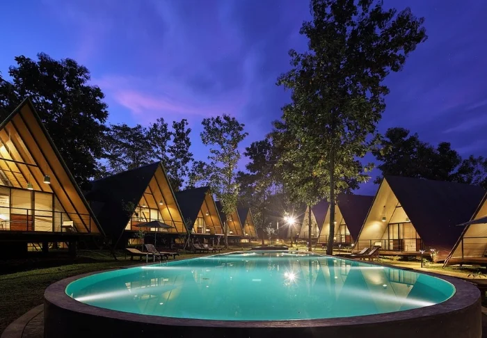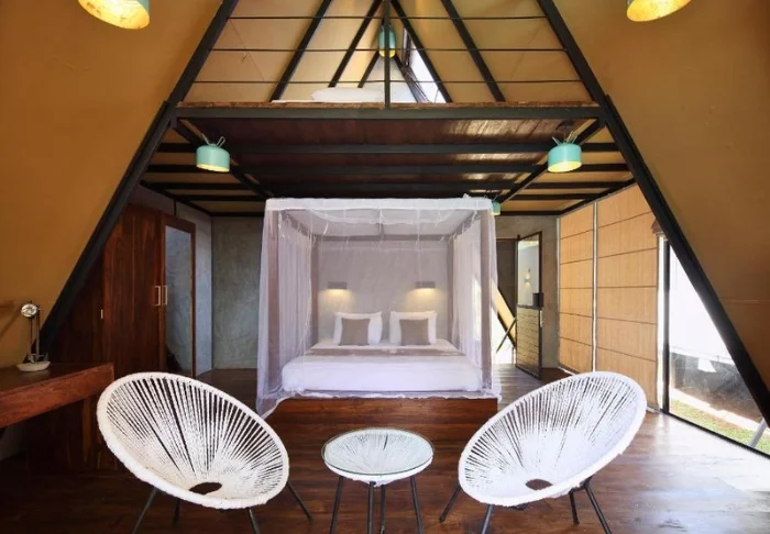 Under din vistelse bor du i en lyxig tältstuga där komfort och naturnära upplevelser smälter samman. Tältet är inrett med moderna möbler och stora fönster som vetter mot resortens pool och det frodiga landskapet. Du får känslan av att vara nära naturen utan att göra avkall på viktiga bekvämligheter som aircondition, minibar, värdeskåp och wifi. Det öppna badrummet är utrustat med både regndusch och badkar. Dessutom har tältet en egen balkong där du verkligen kan njuta av naturens oändliga stillhet.