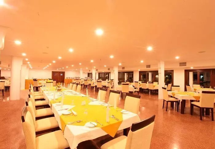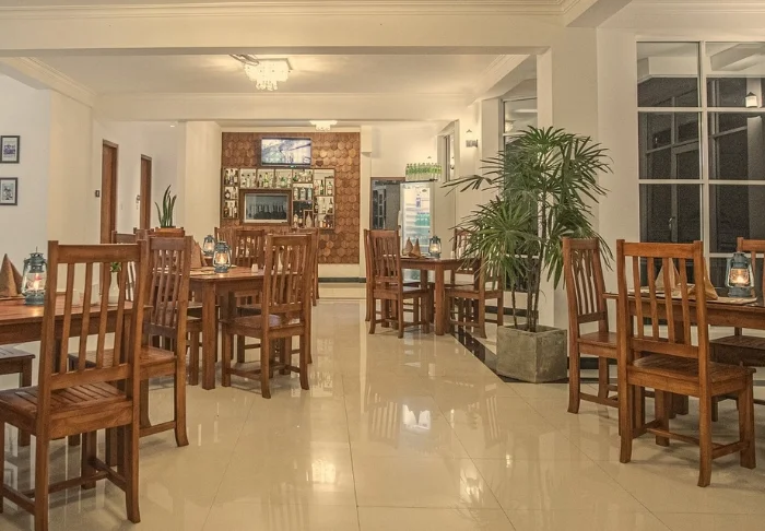 Hotellets restaurang har öppet morgon, lunch och kväll och serverar både västerländska och autentiska lankesiska rätter.