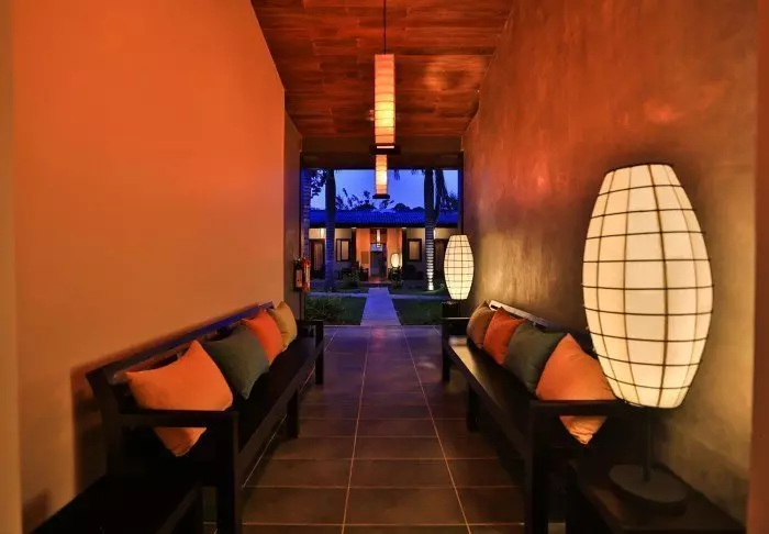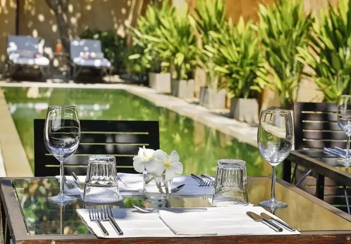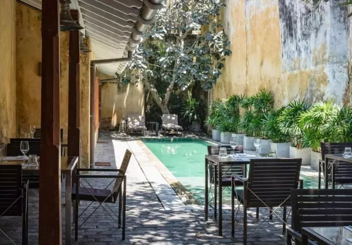 Hotellet har en idyllisk trädgård med vackra plumeriablommor (frangipani), som står i kontrast till de charmigt avskalade, gula murarna. Här finns även en liten pool med tillhörande solstolar.