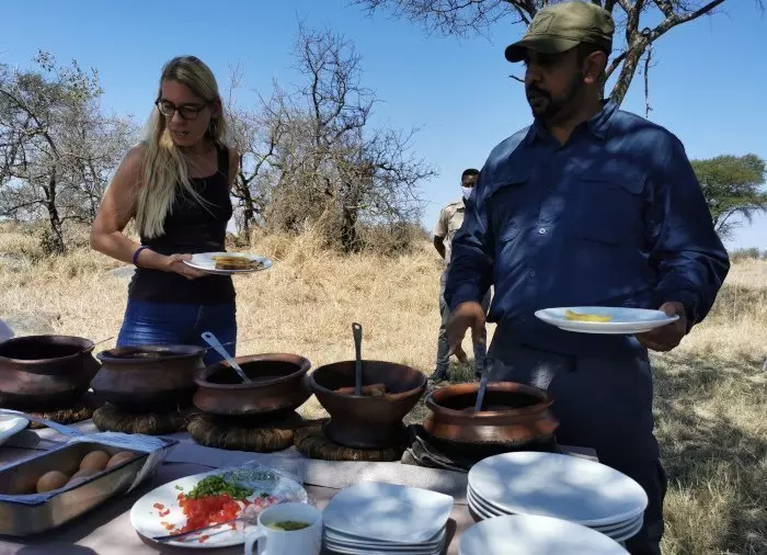 En bushlunch består normalt av ett urval av kött, fisk och kyckling samt olika sallader och grönsaker. Det hela serveras i en buffé, som naturligtvis också bjuder på färsk frukt och dessert. När du har köpt din dryck i baren är det bara att slå dig ner och njuta av lunchen med utsikt över djurlivet på slätterna.