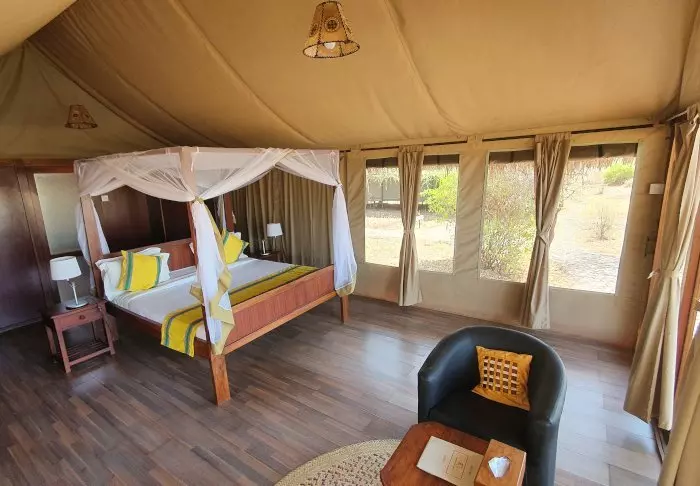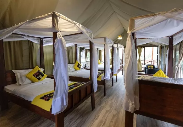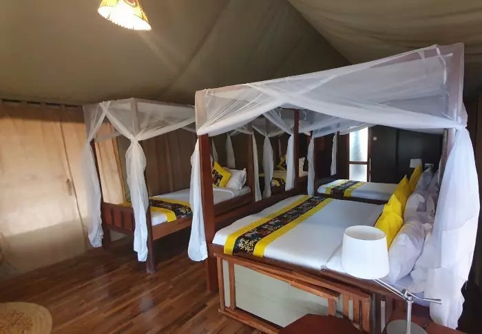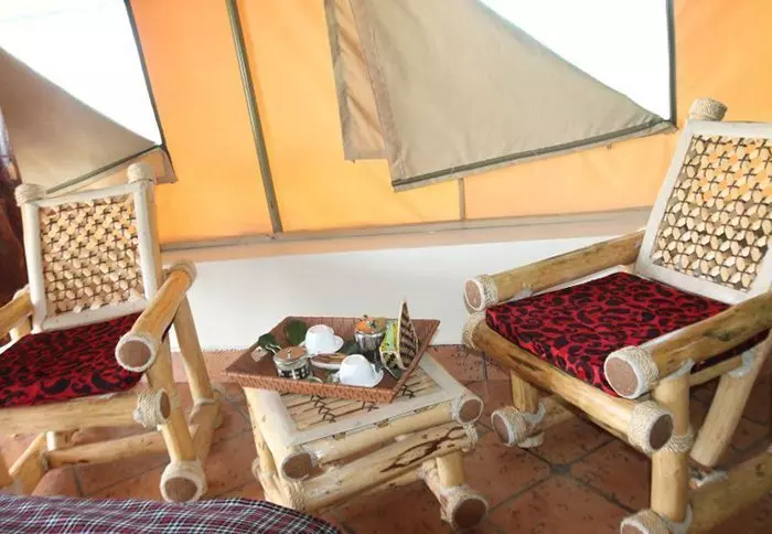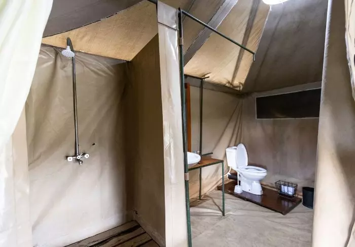 Campingen består av 24 bekväma tält med plats för två eller tre personer i varje. Tälten är stora och alla har dusch, toalett, skrivbord och stora sängar med myggnät. Varje tält har också en liten terrass utanför med stolar där du kan koppla av och njuta av de fantastiska omgivningarna. Det finns ett stort, gemensamt tält som fungerar som mattält.