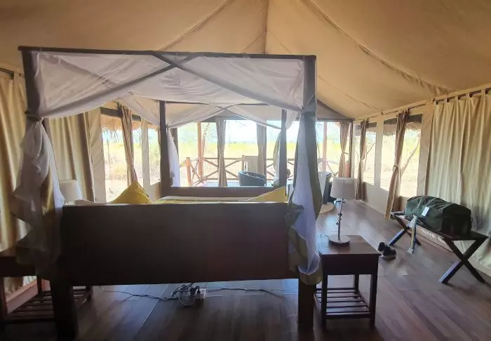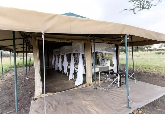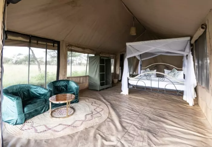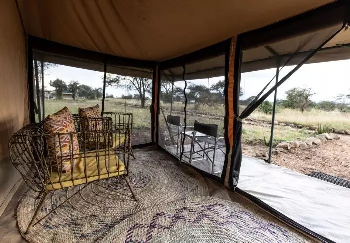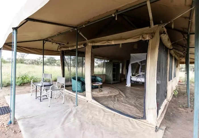 Tälten är stora och har massor av plats och luft runt de två kingsize-sängarna. Från vardagsrummet kan du gå ut på en allmän veranda och därifrån har du en fantastisk utsikt över Serengeti Plains. Alla tält har eget badrum med toalett och dusch. Det finns också ett badkar som du kan koppla av i med utsikt över nationalparken. Dessutom finns det en privat utomhusdusch som också bjuder på en fantastisk utsikt över Serengeti Plains.