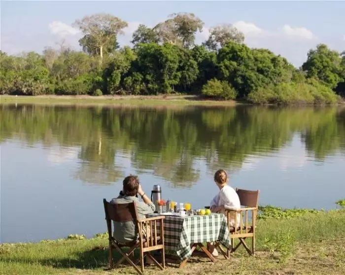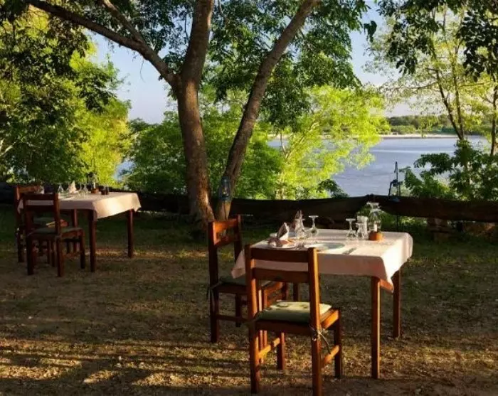 Från restaurangen har du en fantastisk utsikt över området som ligger mitt i djurens väg ut. Området är dessutom hemvist åt stora flockar med olika antiloparter, bufflar, elefanter, flamingor och andra fågelarter.