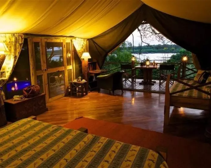 Lodgen består av 20 lyxtält som är byggda med en sofistikerad kombination av sten och kanvas. Sidorna består av kanvas så du får en äkta safarikänsla med ljuden och dofterna från djuren utanför. Halmtaket och de delar av väggarna som är byggda i sten gör att de mer känns som rum än som tält. Lyxtälten är byggda med stenpelare och svävar nästan över jorden vilket ger luftgenomströmning och en enastående utsikt.