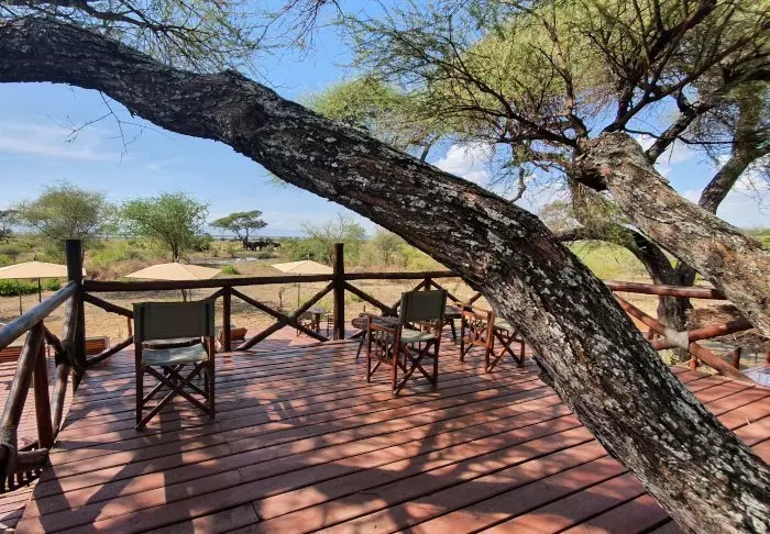 Från restaurangen har du en fantastisk utsikt över området, som ligger längs färden för migrationen. Området är dessutom hemvist åt stora flockar med olika antiloper, bufflar, elefanter, flamingor och andra fågelarter.