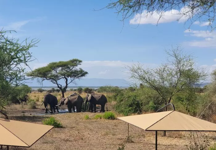 Utsikten från det upphöjda däcket på Tarangire Simba Lodge är fenomenal. Det är nästan så att du inte behöver åka på safari. Det permanenta vattenhålet lockar till sig djur hela dagen – rakt framför dina ögon, på första parkett.