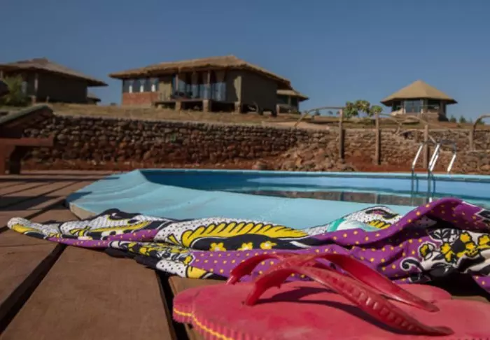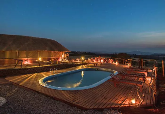 Njut av ett svalkande dopp i den lilla poolen efter avslutad safari – och en drink kring lägerelden på kvällen. Se fram emot middagen: maten kommer från markerna omkring lodgen och kaffet är naturligtvis lokalt!