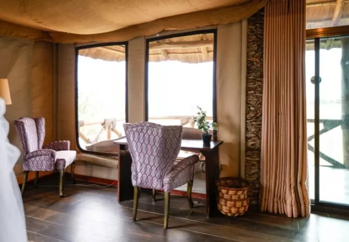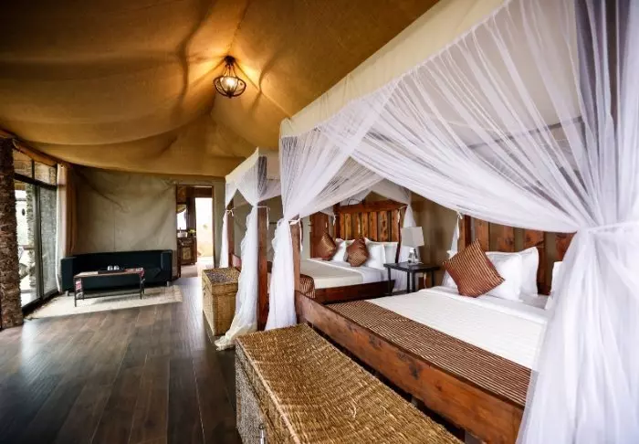 Lodgen består av 20 lyxtält som är byggda med en sofistikerad kombination av sten och kanvas. Sidorna består av kanvas så du får en äkta safarikänsla med ljuden och dofterna från djuren utanför. Halmtaket och de delar av väggarna som är byggda i sten gör att de mer känns som rum än som tält. Lyxtälten är byggda med stenpelare och svävar nästan över jorden vilket ger luftgenomströmning och en enastående utsikt.