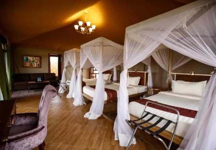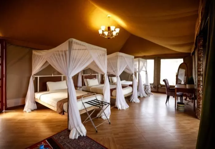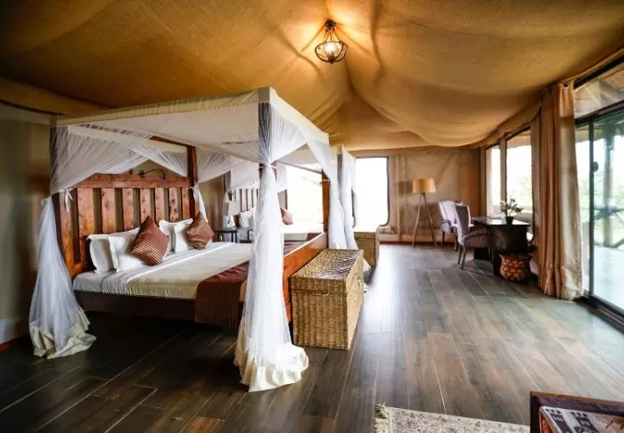Tälten är stora och har massor av plats och luft runt de två kingsize-sängarna. Från vardagsrummet kan du gå ut på en allmän veranda och därifrån har du en fantastisk utsikt över Serengeti Plains. Alla tält har eget badrum med toalett och dusch. Det finns också ett badkar som du kan koppla av i med utsikt över nationalparken. Dessutom finns det en privat utomhusdusch som också bjuder på en fantastisk utsikt över Serengeti Plains.