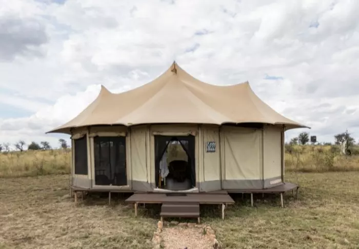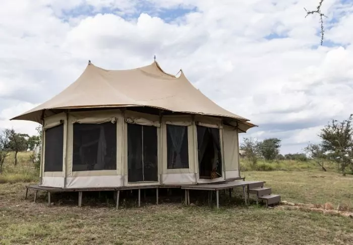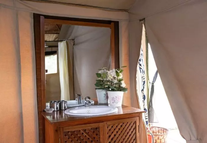 Tälten är utrustade med dusch och toalett, sängar med myggnät samt sittplats inom- och utomhus, där du kan koppla av med en god bok och njuta av den fantastiska omgivningen.