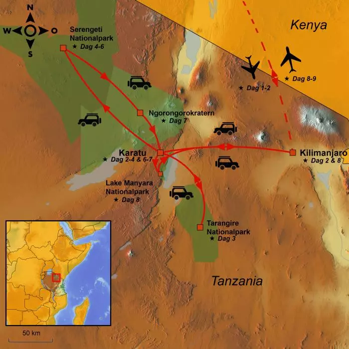 | Dag 8 | Lake Manyara ca. 25 km till Kilimanjaro Airport ca. 170 km | 195 |