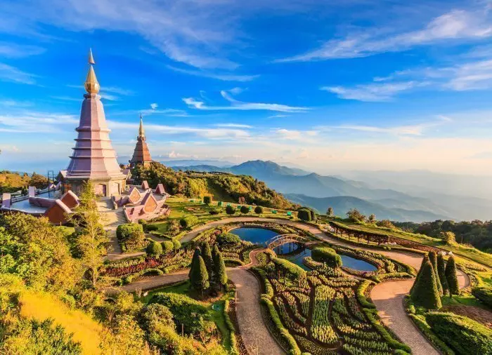 Nästa besök är bergets fint omskötta trädgård, där två stora pagoder med gyllene spiror sträcker sig mot himlen. Dessa restes till minne av kung Bhumibol Adulyadej (Rama IX) och hans fru. Molnfria dagar är utsikten häruppe fullkomligt fantastisk och vintergröna skogar ligger som mattor över de böljande bergen.