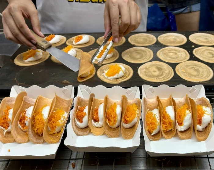 Du promenerar vidare till fots genom en av Bangkoks mest stämningsfulla gamla handelsgator, där historiska butikshus, gatukonst och ny kreativ energi flyter samman. Under vägen får du smaka traditionella ångade bullar – ett klassiskt mellanmål med rötter i områdets kinesiska kultur och en symbol för lycka och välstånd.
