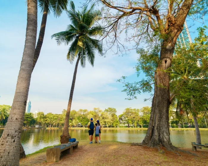 Efter att ha vandrat runt i Bangkoks tropiska värme och bullrande trafik kommer det säkert finnas stunder då du drömmer om grönare och lugnare platser. Då kan du med fördel besöka parkerna Lumpini eller Benjakiti. Du kan också välja att ta dig över till flodens västra sida, där du kan uppleva en helt annan värld utan skyskrapor och tutande tuk-tukar. Här möts du av det traditionella Bangkok, med en labyrint av kanaler där husen står på pålar och brevbärare kommer seglande.