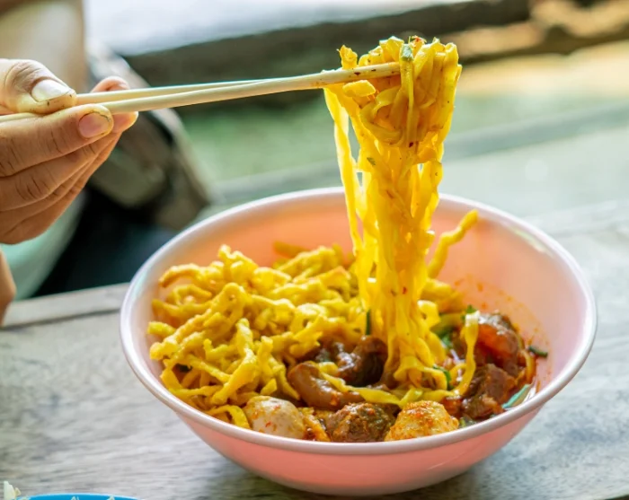Efter 3-4 timmars cykeltur är du tillbaka på startplatsen och sedan väntar en välförtjänt lunch. Lunchen består av rätten “khao soi”, en kryddig nudelsoppa och en specialitet i norra Thailand. Lunchen serveras på restaurangen Naree De Klang Vieng, som drivs av fångar från kvinnofängelset Klang Vieng. Tack vare fängelsets utmärkta rehabiliteringsprojekt får kvinnorna, som ofta är dömda för narkotikahandel eller produktion, möjlighet att utbilda sig inom olika serviceyrken, vilket förbereder dem för ett nytt liv utanför fängelsets murar. Maten och servicen är superb!
