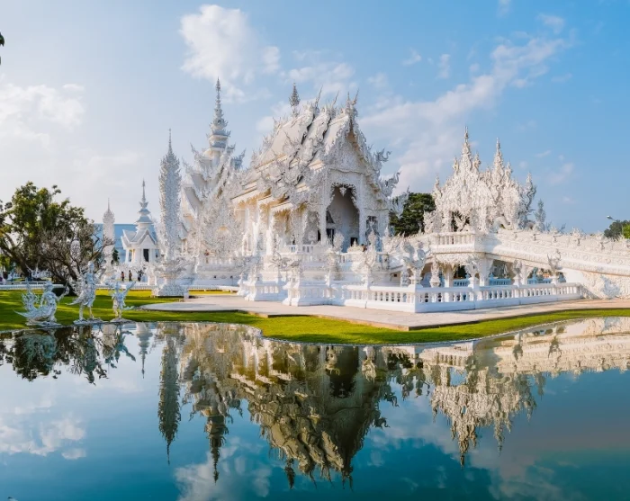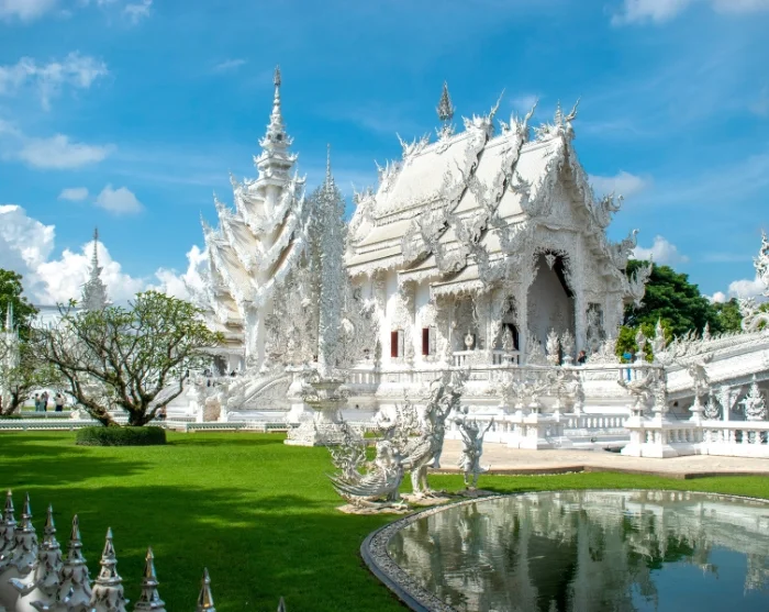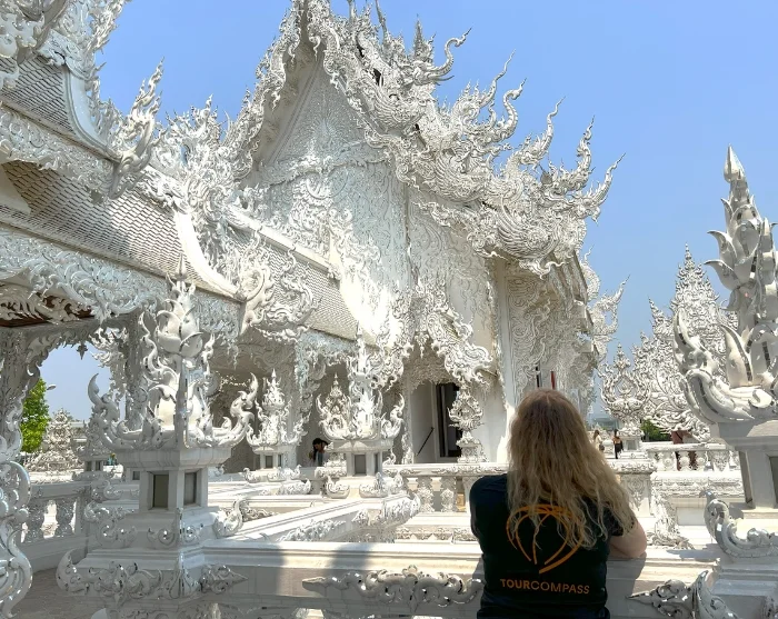 På väg till Chiang Rai besöker du det imponerande templet Rong Khun, mer känt som Det Vita Templet. Detta moderna mästerverk från 1997 är skapat av den lokala konstnären Chalermchai Kositpipat och skiljer sig markant från Thailands traditionella tempel. Den unika vita och silverfärgade fasaden symboliserar renhet och upplysning, medan de många detaljerna bjuder på både religiösa och överraskande moderna referenser.