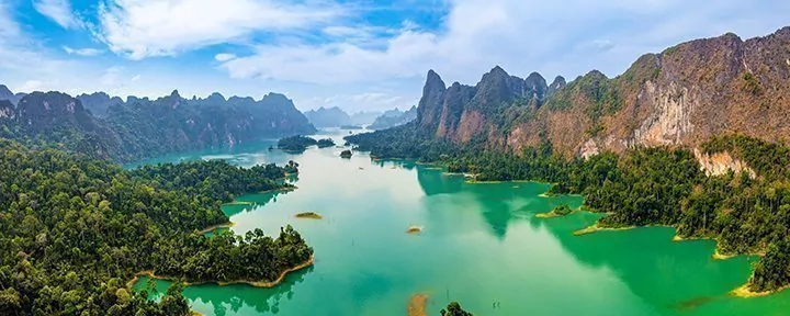 En del av Khao Sok nationalpark består av den 165 km² stora, smaragdgröna sjön Cheow Lan. Sjön skapades när Rajjaprabhadammen byggdes 1987 och området därefter översvämmades. 385 lokala familjer flyttades och kompenserades, och djur transporterades bort via floderna och med helikopter. När området gradvis översvämmades av regn- och flodvatten förvandlades en del av regnskogen till sjö. De höga kalkstensklipporna, som tidigare reste sig högt över trädkronorna, förvandlades till små regnskogsöar som idag sticker upp ur det smaragdgröna vattnet. Det är inte utan anledning som Cheow Lan ibland beskrivs som Thailands svar på Guilin, en av Kinas vackraste platser.