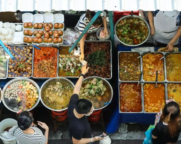 Den första smakupplevelsen är en skål med ”tom yum wonton”, där den klassiska thailändska soppan serveras med fyllda dumplings och bjuder på en perfekt balans av starka, syrliga och aromatiska smaker. Därefter följer du doften av grillspett till nästa stopp, där satayspett med grillat fläskkött tillagas över kol och serveras med en krämig jordnötssås.