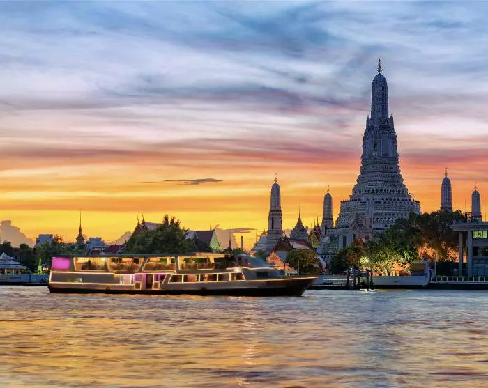 Kvällen avslutas med en stämningsfull tur förbi Grand Palace och City Pillar innan du når flodstranden mittemot Wat Arun. Templet står vackert upplyst på andra sidan av Chao Phraya-floden och utgör en imponerande kuliss för resans sista stopp.